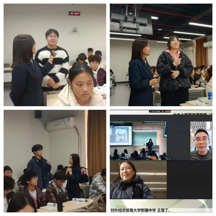 (通讯员:赵泽文 王雪丁 刘洁 摄影:赵泽文 窦浩 鲁新月)为贯彻落实习近平总书记关于大中小学思政课一体化建设系列重要论述和学校党委提出的思政课提质增效“三三一工程”,10月28日上午,中国传媒大学马克思主义学院第十期大中小学思政课教师“共上一堂课”展示活动在立德楼208教室举行。本次课堂教学采取线上线下相结合方式,由思想政治教育教研部教师刘洁和对外经济贸易大学附属中学教师王雪丁共同完成,北京大学2025-2026学年马克思主义学院访问学者、进修教师和对外经济贸易大学附属中学思政课教师进行观摩指导。