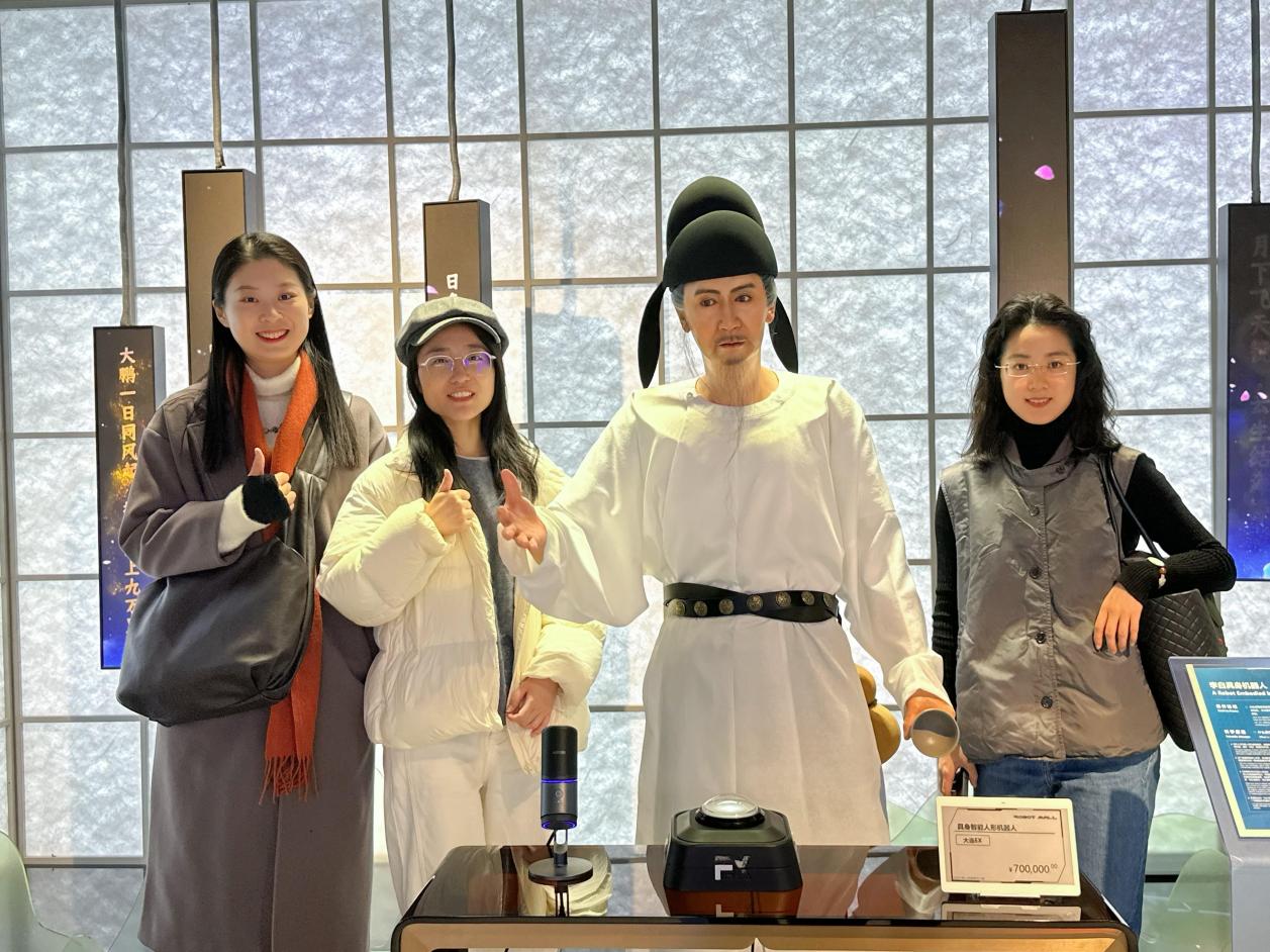 现场互动中,三位思政课教师主动打破“理论讲授者”身份局限,既是实践参与者也是思政引导者:与古诗词机器人“李白”开展人机对谈,探寻传统文化与现代科技的融合之道;与仿真爱因斯坦机器人交互时,结合其智能应答探讨人格化AI在思政教育中的应用价值,引发师生对“人机共生”背景下育人使命的热烈研讨,让“行走的思政课”焕发出鲜活生命力。