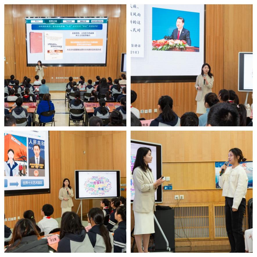 钟思雨老师与小学、初中、高中三个学段的教师代表用四节思政课现场教学向大家展示了新时代中国以共商共建共享为核心原则,向世界弘扬全人类共同价值,也呈现了朝阳区在打造大中小学思政教育一体化课程建设的创新实践。