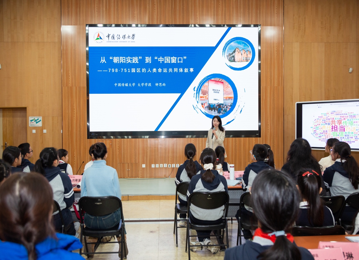 钟思雨展示的课程主题为“从‘朝阳实践’到‘中国窗口’—798·751园区的人类命运共同体叙事”,她带领学生探索人类命运共同体理念在朝阳区如何落地生根,用鲜活有趣的案例深入浅出地阐明人类命运共同体格局形成的世界之问、798之答、朝阳之范,引发同学们的思考。