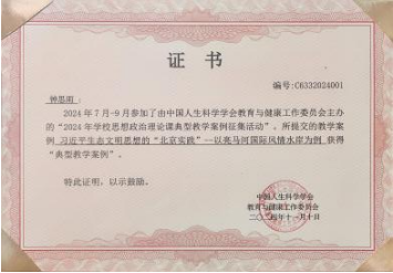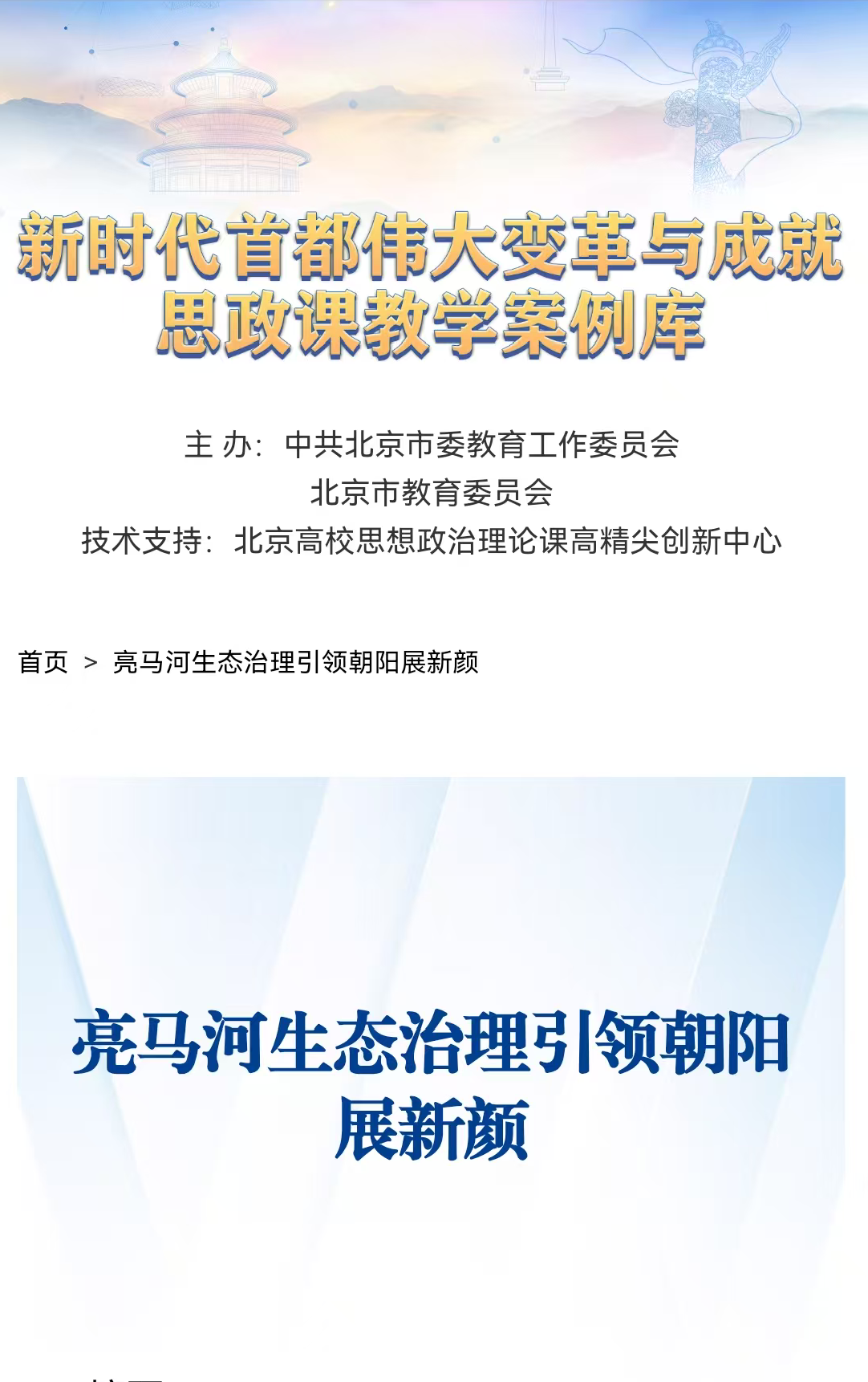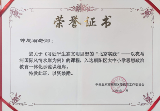 近年来,钟思雨老师逐步构建起系统化、层次化的教学成果体系:其主持设计的“走进798·751园区探索习近平文化思想在京华大地生动实践”入选2025年北京市大中小学思政“实景课堂”优秀案例;参与全国首个思政实践教学“数字地图”建设,录制大学阶段“习近平生态文明思想的‘北京实践’——以亮马河国际风情水岸为例”课程相关教案获评2024年全国思政课典型教学案例;撰写的《亮马河生态治理引领朝阳展新颜》被收录于“新时代首都伟大变革与成就”教学案例库,并在北京高校思想政治理论课高精尖创新中心平台上线。此外,她主持的多项教学案例与课程先后入选朝阳区大中小学思想政治教育一体化工作案例库、示范课程库。