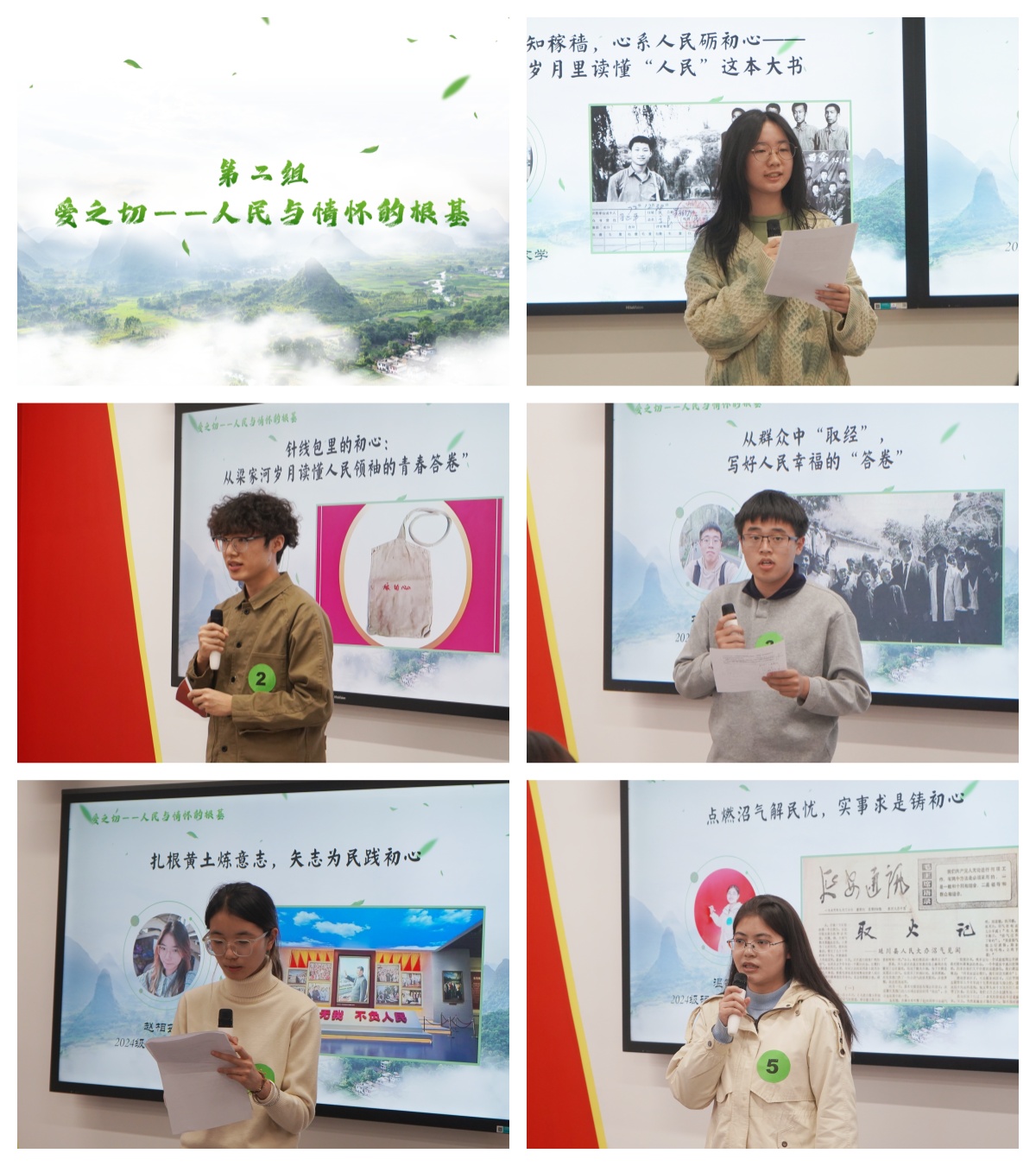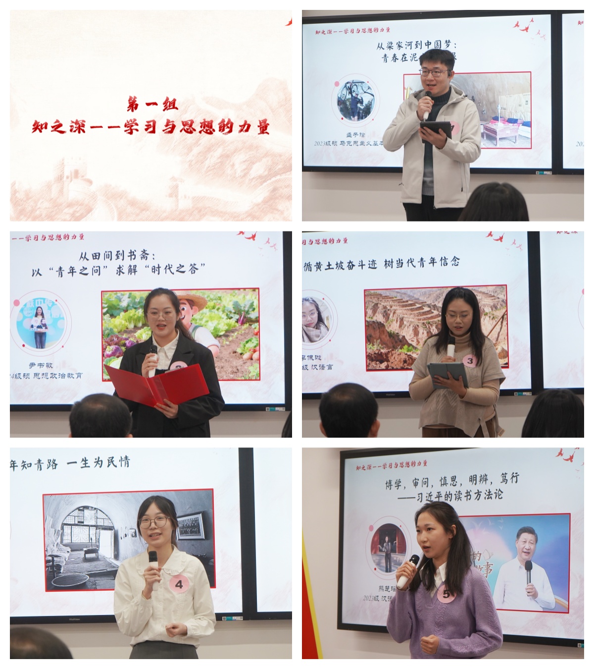 第一组出场的盛子晗同学立足宏观,讲述《从梁家河到中国梦:青春在泥土中生根》的时代叙事;尹书敏同学从自己在兴安盟的一次“除草”经历说起,联系自身,探讨青年学子如何将实践思考与理论学习结合,书写实干答卷;李佩璇同学则聚焦精神,展现《循黄土坡奋斗迹,树当代青年信念》的执着追求;徐偲艺同学回顾习近平读书思考、苦干实干的岁月,为当代青年锤炼意志、扎根基层提供精神指引;熊楚瑶同学从读书方法论角度,阐发《博学审问慎思明辨笃行》的读书哲学。五位同学从不同角度诠释了青春与信仰的力量,展现了初生牛犊的锐气与思考。