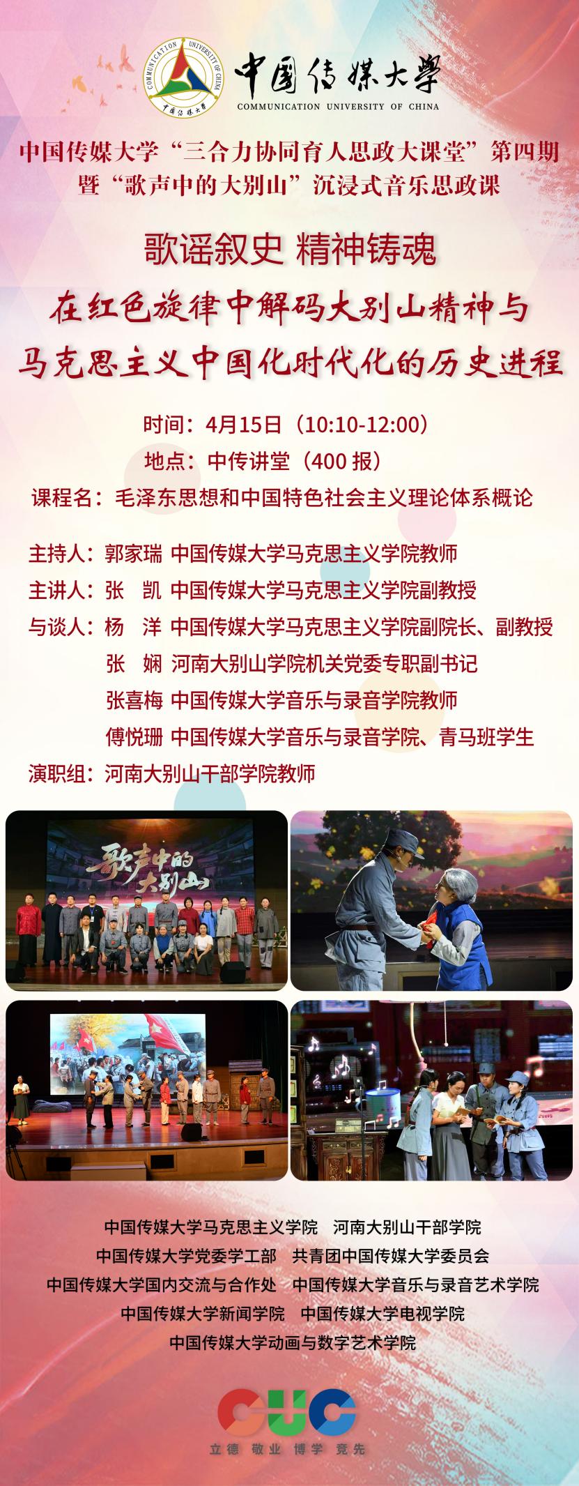 本期课堂以“歌谣叙史 精神铸魂——在红色旋律中解码大别山精神与马克思主义中国化的时代回响”为主题,将于2026年4月15日上午10:10在中传讲堂(400报)正式开讲。课堂打破传统思政课堂边界,以歌叙史、以乐铸魂,带领师生在红色旋律中感悟精神力量,践行青春使命。