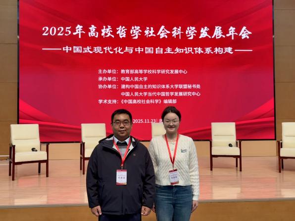 (通讯员 买凡)11月23日,2025年高校哲学社会科学发展年会在中国人民大学举办,来自全国多地的专家学者、青年学子围绕“中国式现代化与中国自主知识体系构建”主题展开研讨。此次年会由教育部高等学校科学研究发展中心主办,中国人民大学承办,《中国高校社会科学》提供学术支持。 我校马克思主义学院副院长高宇副教授与2023级思想政治教育专业硕士研究生买凡合作撰写的论文入选此次年会,两位作者受邀参会,高宇在平行会议...